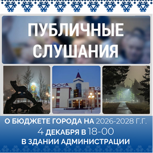 04.12.2025 года в 18 часов 00 минут в конференц-зале администрации города Покачи, по адресу: город Покачи, улица Мира, 8/1 (4 этаж) состоятся публичные слушания по проекту решения Думы города Покачи «О бюджете города Покачи на 2026 год на плановый период 2027 и 2028 годов», в котором отражена информация о перспективном планировании бюджета.