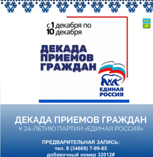 Уважаемые жители города! С 1 декабря по 10 декабря 2025 года депутаты Думы, в рамках работы Местной общественной приемной партии «ЕДИНАЯ РОССИЯ», проведут Декаду приемов граждан, приуроченную к 24-летию Партии.