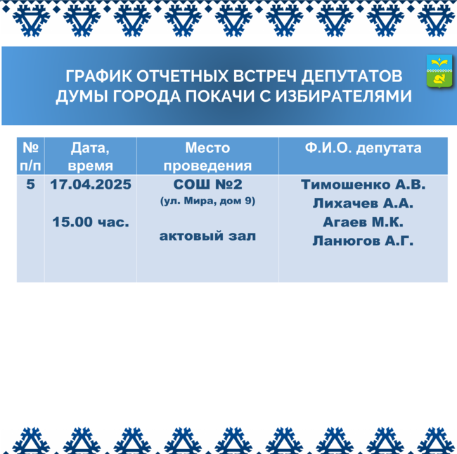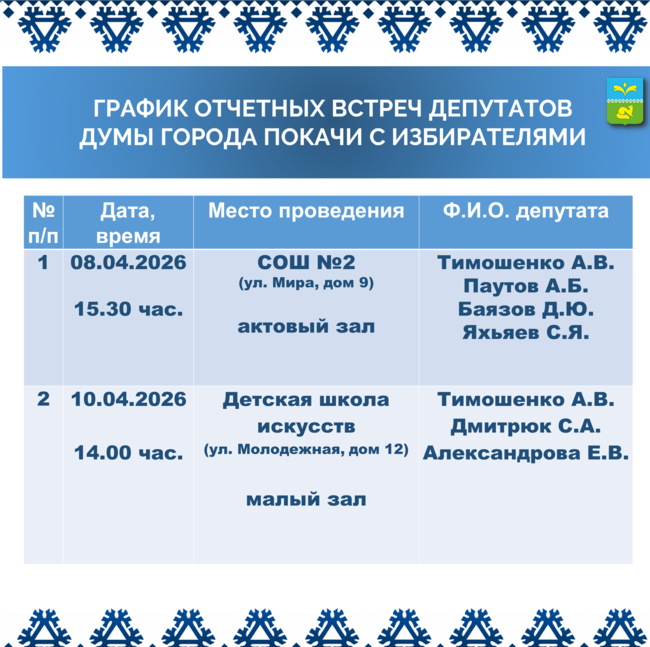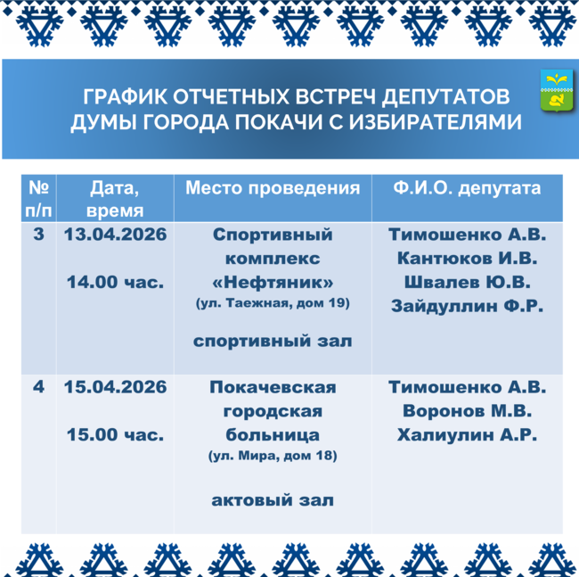 епутаты Думы города Покачи восьмого созыва в апреле 2026 года проведут встречи с избирателями. Подробная информация представлена в графике.